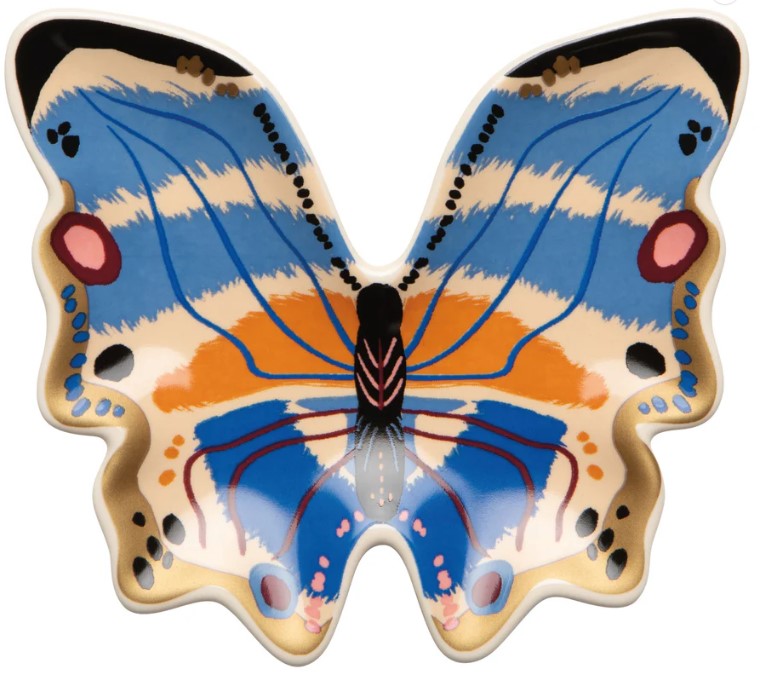 The ceramic Aurora trinket tray, with its unique shape, makes a convenient landing spot for keys, loose change, small jewelry, and paperclips. Spring dawns and a sunrise of color graces the butterflies wings of this design from the Aurora collection.
