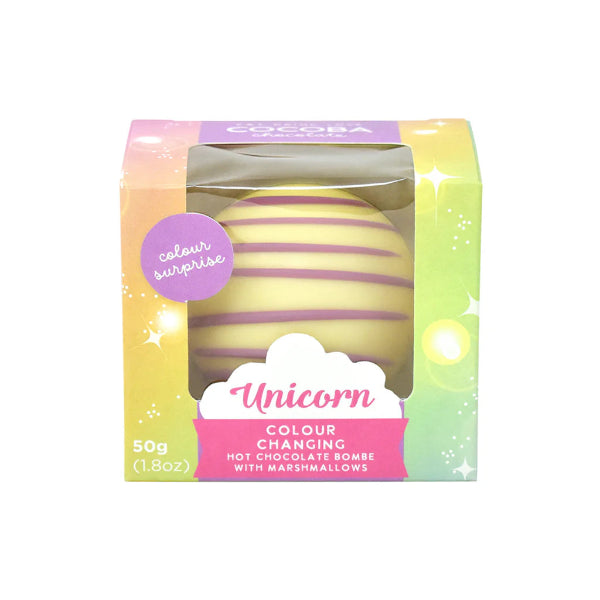 Introducing our most magical hot chocolate bombe yet! Our Unicorn Hot Chocolate Bombe contains a mesmerising, colour changing surprise, plus an abundance of fluffy marshmallows to create a hot chocolate experience that's equally as captivating as it is delicious! Concealed within a Belgian white chocolate bombe that's decorated with an artistic layer of colourful drizzle, these vibrant delights make an extraordinary gift for chocoholics of all ages.