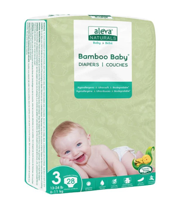 Keep your baby's bottom clean & comfortable with the Aleva Naturals Bamboo Baby Diapers. Our diapers top and bottom layers are made from bamboo fibres called Bamboo Kun. Together with the extra absorbability and breathable back layers, these diapers will help keep your baby’s bottom soft, supple and silky smooth. Plus, our diapers have a 3-line wetness indicator that changes from yellow to green, to let you know when it is time for a change & flexible side panels and pocketed back waistband ensure a snug and comfy fit. The Bamboo Baby diapers are feathery soft, durable, and biodegradable. Designed to provide maximum comfort for your baby, these eco-friendly diapers will be your new go-to. Like all Aleva Naturals products, the Bamboo Baby Diapers are made with premium quality ingredients, so you can enjoy a safe product without harsh chemicals or additives.