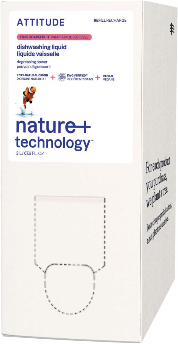 Reuse & refill your preferred dishwashing liquid bottles with our innovative low-plastic refill boxes. Using 82% less plastic that its bottle counterpart, ATTITUDE Nature + Technology™ Dishwashing Liquid Bulk to Go format includes more than five times the amount of product, which means less time running errands, and less packaging waste! ECOLOGO Certified and elaborated with natural, hypoallergenic and plant and mineral based ingredients like saponins, our degreasing formula will help remove stubborn food residue from dishes, pots and pans. That means less scrubbing, more free time!